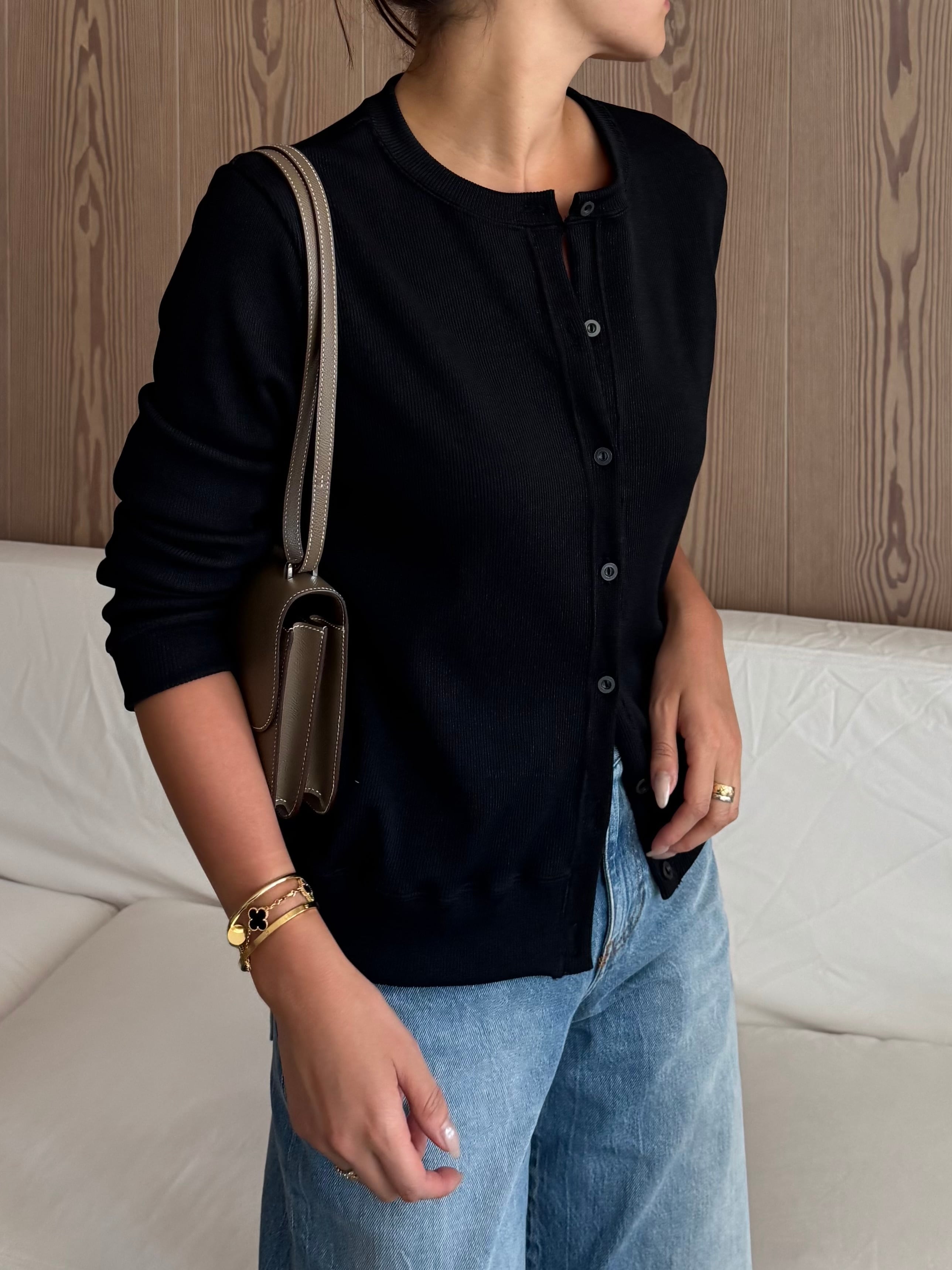 ※白のカーディガンはサンプルなので、首周りが詰まっております。首詰まりを少し抑えた黒い方が実際に販売させていただく形です