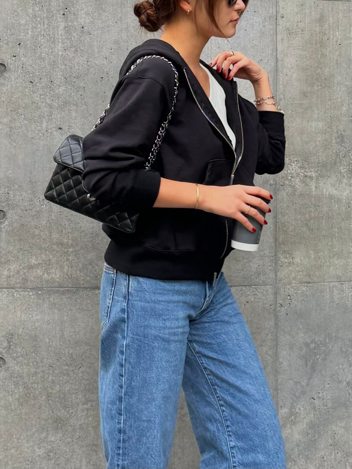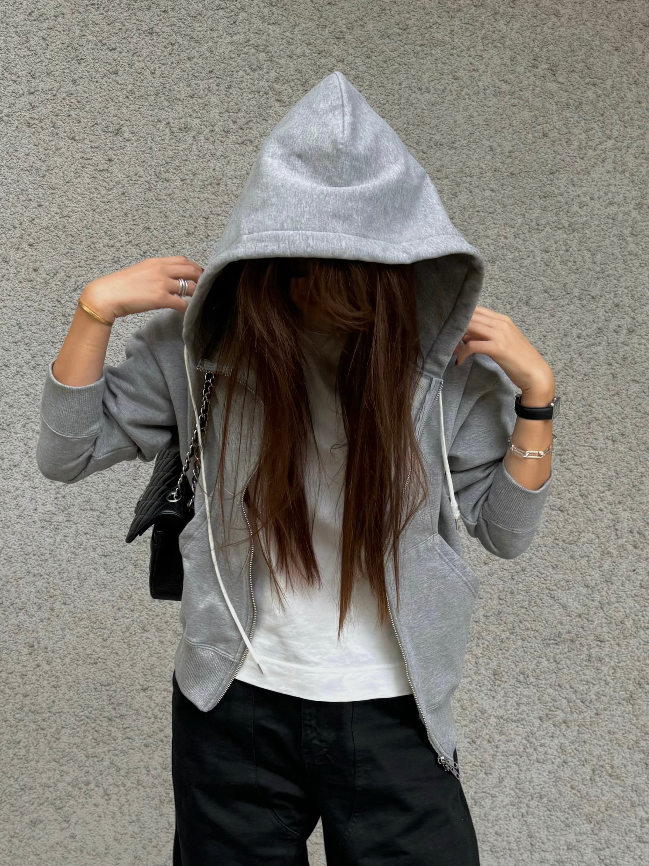 生地の厚み、丈感、フードのボリューム、紐の長さ(グレーのみ)が絶妙にダル着にさせず、他にはないZIPパーカーが出来上がりました。